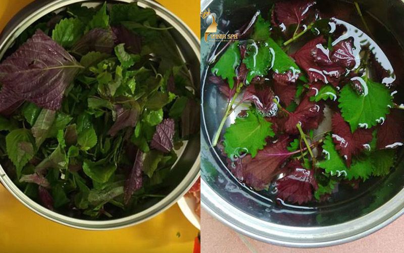 – Bước 1: Lấy 1 ít lá tía tô đem rửa sạch, có thể sử dụng cả lá tươi và lá khô, sau đó bỏ vào đun với nước sôi trong 10 phút.